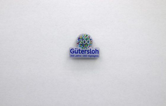 Der Ansteckpin zum Stadtjubiläum 200 Jahre Gütersloh.
